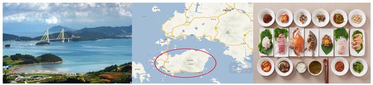 - 2010년 개통돈 거가대교를 통해 갈 수 있습니다. 수많은 산과 절벽이 자아낸 풍경이 뺴어나며 감칠맛이 뛰어난 대구와 숭어가 특산물로 유명합니다.